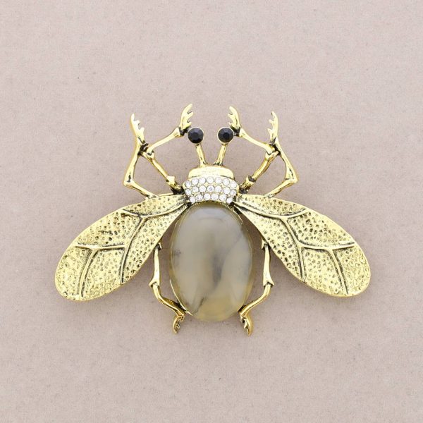 Αυτή η επιβλητική καρφίτσα-έντομο είναι ένα πραγματικό κόσμημα τέχνης. Το πλούσιο σώμα της, στολισμένο με μεγάλη οβάλ πέτρα σε αποχρώσεις γκρι-λαδί, δίνει βάθος και πολυτέλεια, ενώ τα φτερά σε χρυσό τόνο με ανάγλυφη υφή δημιουργούν μια αίσθηση κίνησης και λεπτομέρειας.