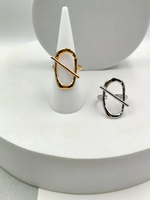 Ένα αφαιρετικό δαχτυλίδι με οργανικό σχήμα και μια κομψή μεταλλική γραμμή που “τέμνει” το σχέδιο. Μοντέρνο, καλλιτεχνικό και ιδιαίτερο, ιδανικό για γυναίκες που αγαπούν την έμφαση στο design.