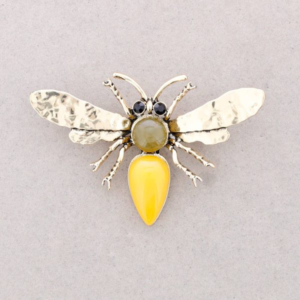 Αυτή η καρφίτσα σε σχέδιο μέλισσας είναι ένα ιδιαίτερο κομμάτι που συνδυάζει τη φυσική έμπνευση με την κομψότητα ενός μικρού έργου τέχνης. Το σώμα της μέλισσας σχηματίζεται από δύο γυαλιστερές πέτρες σε αποχρώσεις του μελιού: μία πιο σκούρα καφε-κεχριμπαρί για τον κορμό και μία πιο φωτεινή, κίτρινη για την κοιλιά. Τα φτερά είναι μεταλλικά, σε σφυρήλατη υφή, με χρυσαφί απόχρωση που δίνει αίσθηση χειροποίητου και vintage χαρακτήρα.