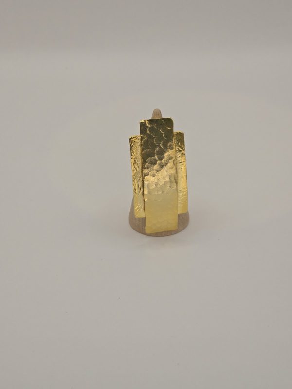 Ένα κοσμοπολίτικο δαχτυλίδι με δύο layered γεωμετρικά panels και hammered υφή που δημιουργεί ένταση, λάμψη και χαρακτήρα. Minimal αλλά επιβλητικό, ιδανικό για σύγχρονα, αστικά looks.