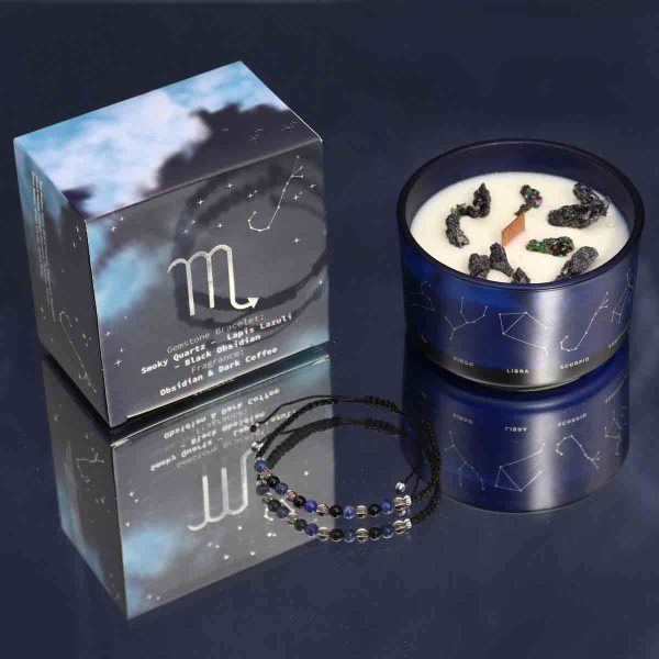 Το κερί Obsidian & Dark Coffee χαρίζει ένα δυνατό, αισθησιακό άρωμα, ενώ το βραχιόλι με Smoky Quartz, Lapis Lazuli και Obsidian ενισχύει τη διορατικότητα, την αυτογνωσία και τη συναισθηματική δύναμη.