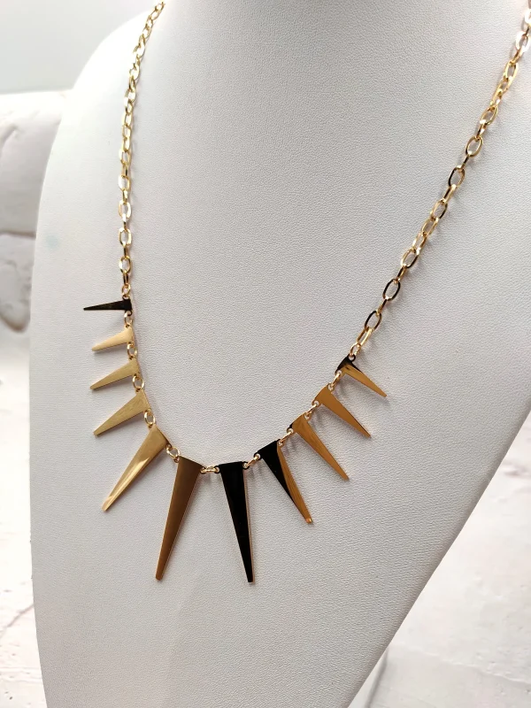 Αυτό το statement κολιέ αποτελεί μια εντυπωσιακή και δυναμική επιλογή για γυναίκες που αγαπούν το μοντέρνο, τολμηρό στυλ χωρίς υπερβολές. Η σχεδίασή του βασίζεται σε μια σειρά από μεταλλικά “spikes” με καθαρές γεωμετρικές γραμμές, που δημιουργούν ένα εντυπωσιακό παιχνίδι φωτός και κίνησης. Η διάταξη των στοιχείων σχηματίζει έναν κομψό ημικύκλιο, προσδίδοντας στο κολιέ sculptural αισθητική και ένα αναβαθμισμένο, fashion-forward αποτέλεσμα. Κυκλοφορεί σε δύο εκδοχές, χρυσή και ασημί, ώστε να μπορείς να επιλέξεις αυτή που ταιριάζει καλύτερα στο προσωπικό σου στιλ.
