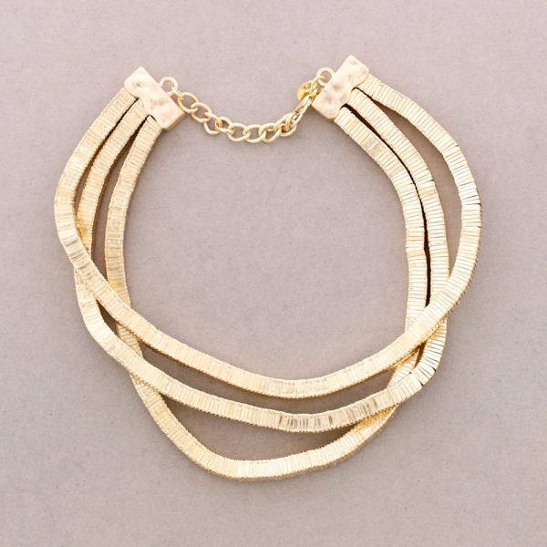 Ένα εκλεπτυσμένο, χρυσό statement κολιέ με τρεις ελαφρώς κυματιστές γραμμές που πέφτουν αρμονικά στο λαιμό, δημιουργώντας μια αίσθηση ρευστότητας και λάμψης. Minimal αλλά ταυτόχρονα εντυπωσιακό, είναι ένα κόσμημα που αναβαθμίζει άμεσα κάθε εμφάνιση.